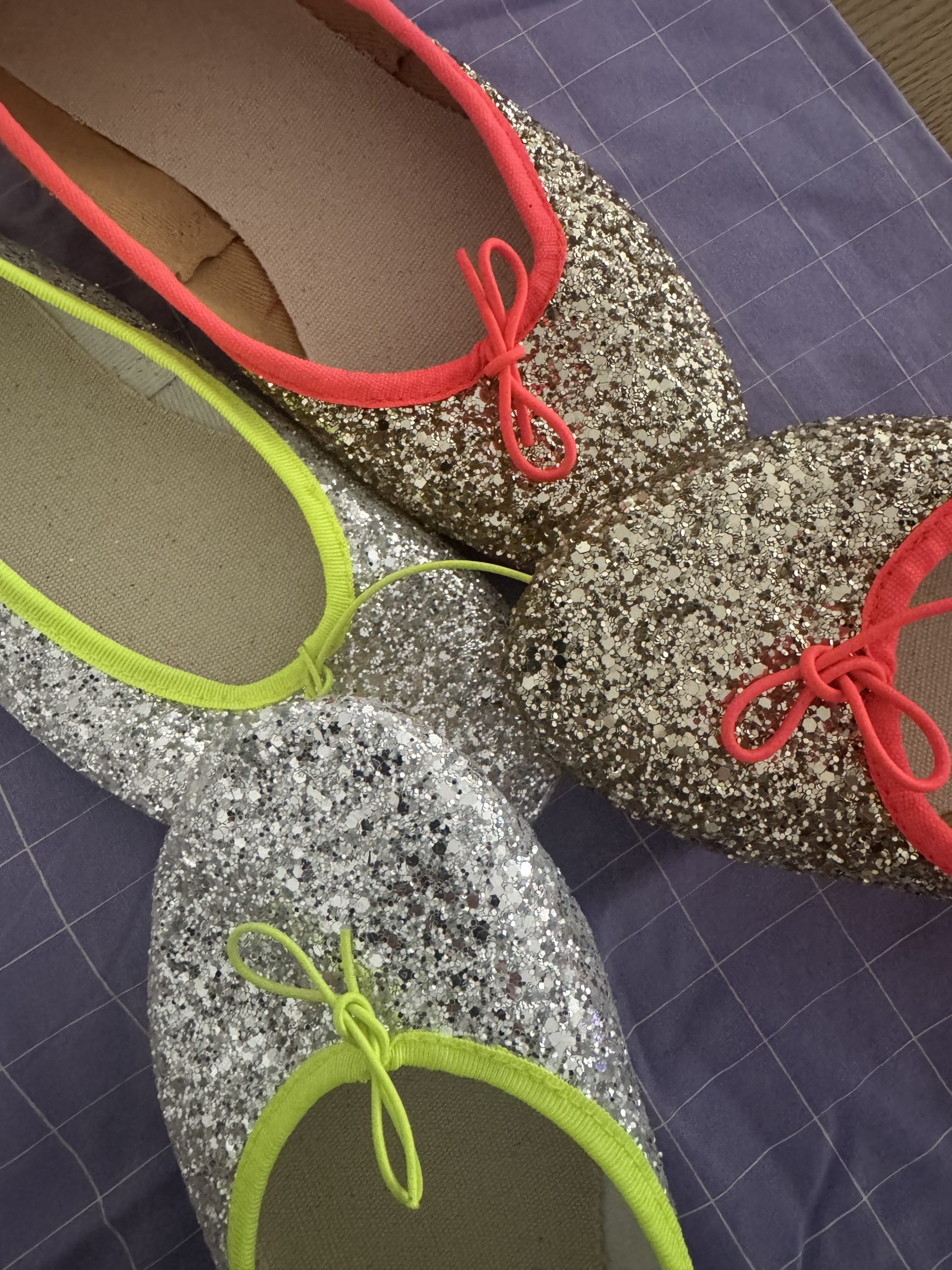 Las bailarinas brilló pueden ir con ribete al tono o con otro color si quieres otro puedes ponerlo en comentarios.